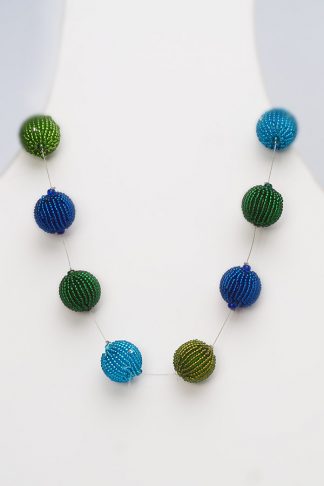 Bedford Design Necklace. Regrettably the photo does not do this piece justice, as it has the glorious colours of a peacock and is quite lovely. Individually beaded balls in turquoise, teal, green and blue. Can be worn to dress-up or dress-down your outfit. Handmade in South Africa by Zulu Master Beaders.