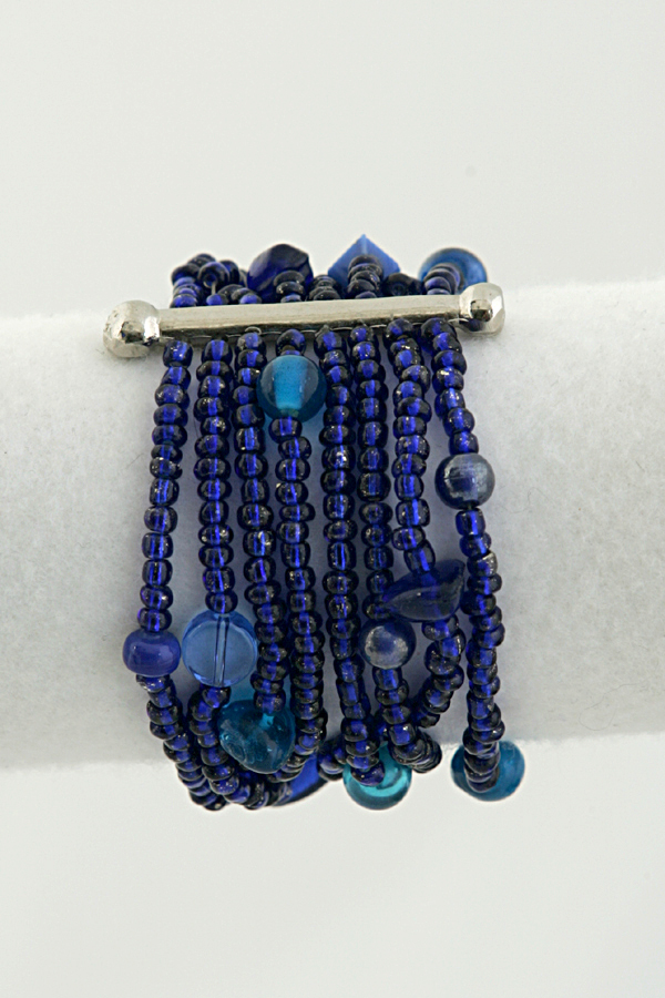 Jewellery Bracelet Zulu made beaded stretchy cuff in royal blue dotted with larger beads. With silver coloured metal separator. Made in South Africa.